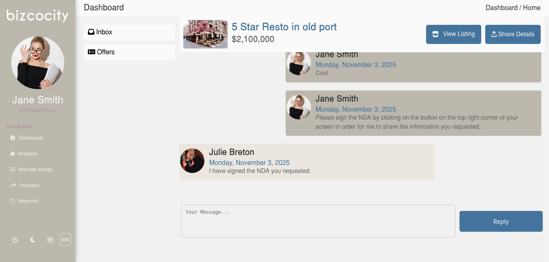 Our new dashboard introduces a fully upgraded suite of tools designed to help you close quicker. At the center of our dashboard is our new messaging platform which facilitates both communications between buyers and brokers as well as sellers and brokers. We are also providing analytics and insights to better assist brokers in the sale of their businesses.